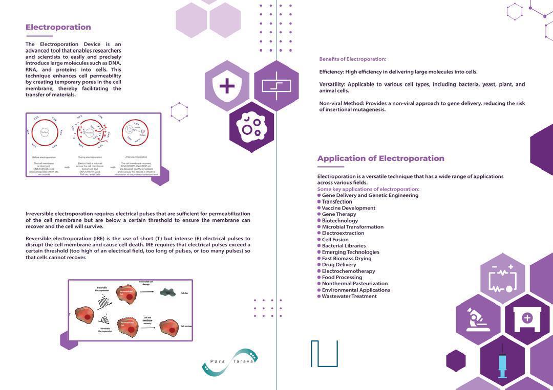 دستگاه الکتروپوریشن* دستگاه الکتروپوریشن مناسب برای انواع سلولها* ایجاد پالسهای مربعی و نمایی* ایجاد میدانهای الکتریکی تا شدت ۲۵۰۰ ولت* قابلیت تغییر ولتاژ، زمان و تعداد پالس* ایدهآل برای آزمایشگاههای تحقیقاتی و دانشگاهی، مراکز داروسازی و واکسن سازی
